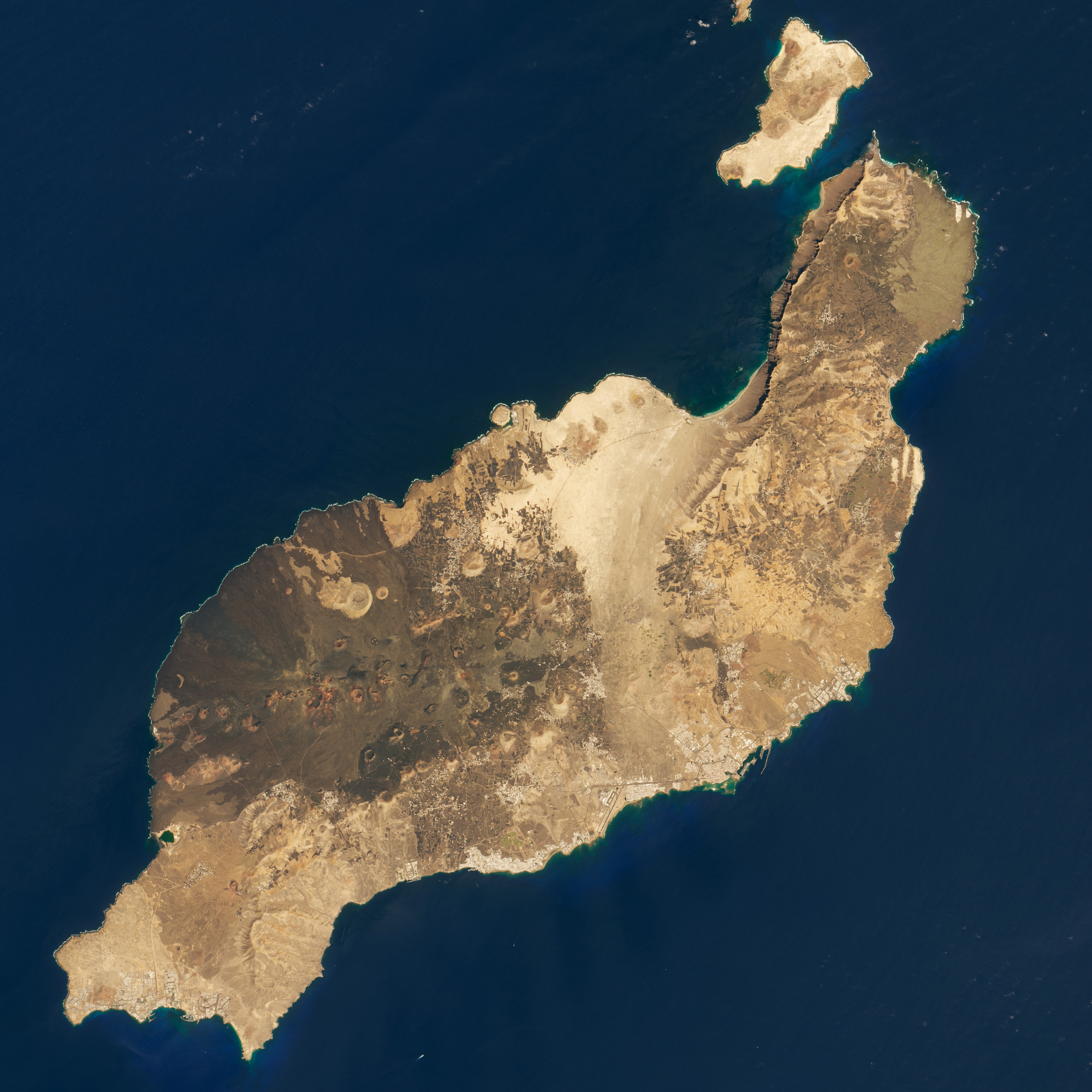 The landscape of Lanzarote, one of the Spanish-owned Canary Islands, has been shaped by hundreds of years of volcanic activity. Located about 78 miles (125 km) off the north coast of Africa, the island contains numerous volcanic “tuff cones,” the largest of which — Caldera Blanca — measures 3,760 feet (1,140 m) across and 1,500 feet (450 m) tall. Lanzarote’s unique terrain and desert-like climate has been used to train astronauts and test Mars rovers.