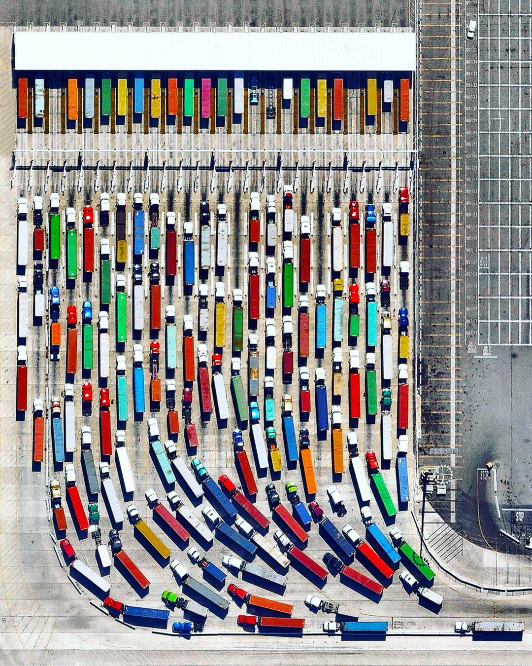 Long-haul trucks wait in line to exit the Port of Los Angeles in California. It is estimated that there are 3.5 million truck drivers in the United States and they drive nearly 140 billion miles on American highways every year. In total, 433 billion miles are covered annually by the entire population.