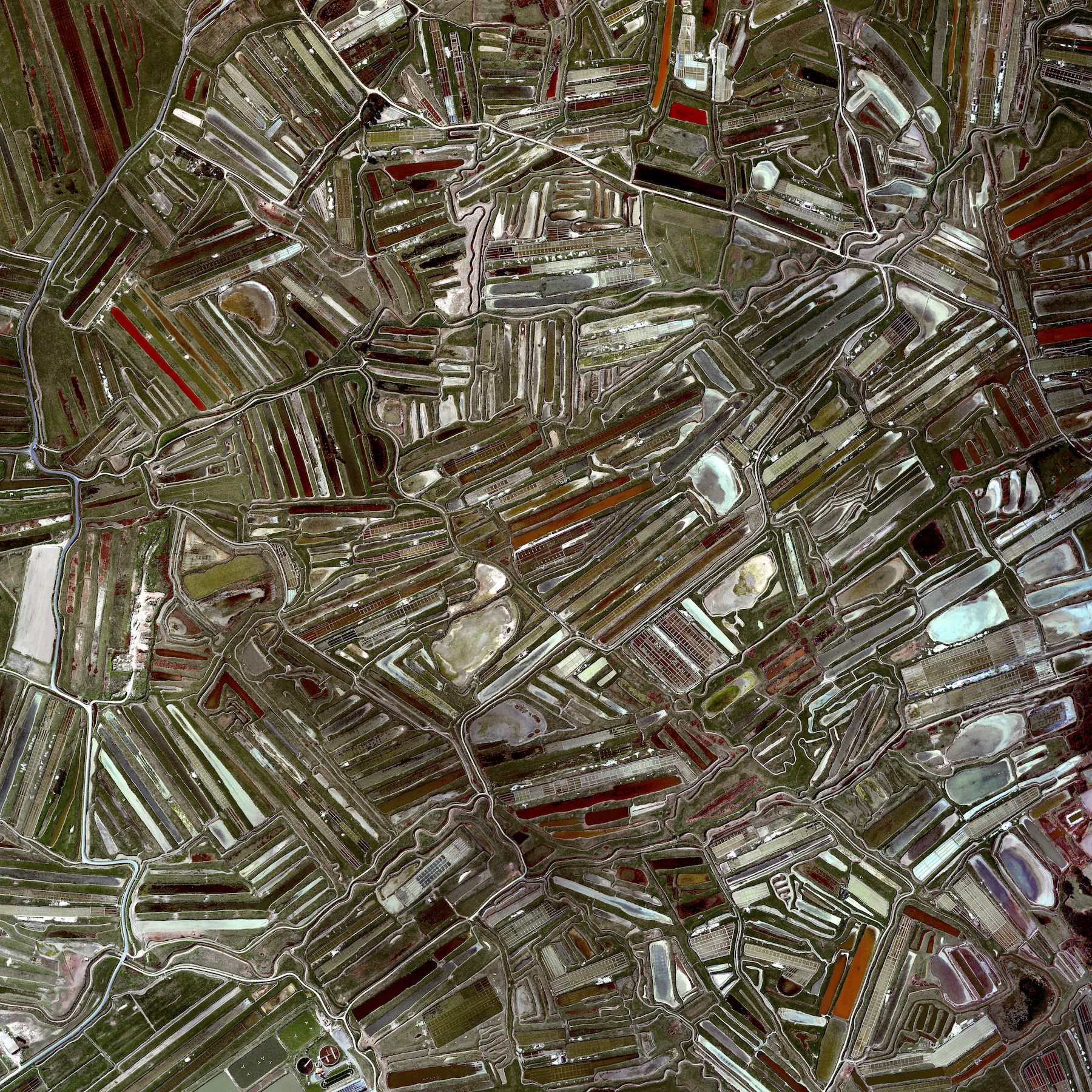 Salt pans are visible on Île de Noirmoutier, an island off the western coast of France. Here, more than 800 tonnes of salt are extracted annually through evaporation. Sea water is channeled into the basins via canals, which pass through reservoirs that get progressively shallower. Over time, evaporation causes the salt to crystallize and it is then carefully extracted from the pans.
