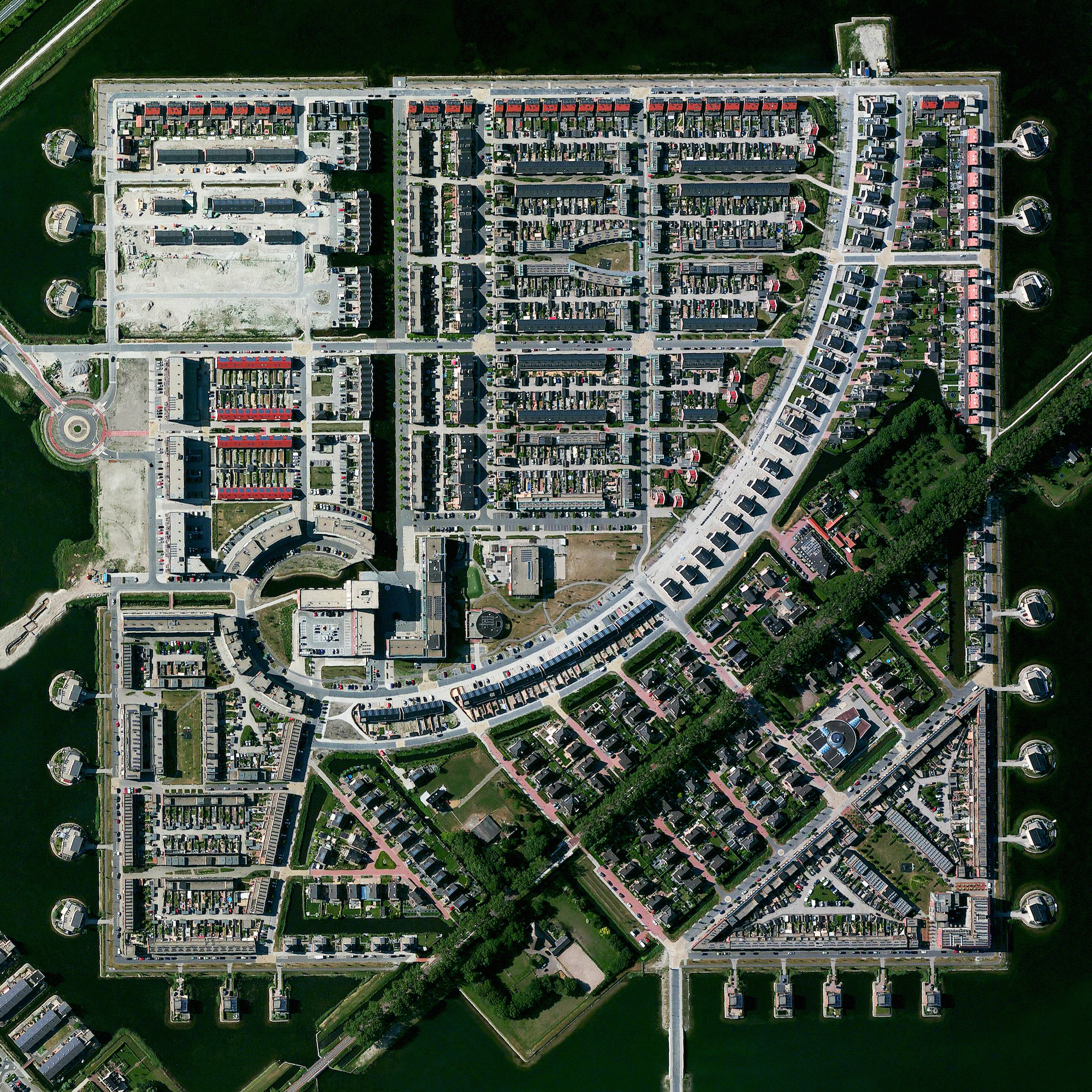 Heerhugowaard is a city built on reclaimed land in the West-Frisia region of the Netherlands. It lies almost 10 feet (3 m) below sea level and is home to roughly 55,000 people. This particular district of Heerhugowaard is called Stad van de Zon (City of the Sun), because its 1,500 homes are directed toward the sun to harness solar power.