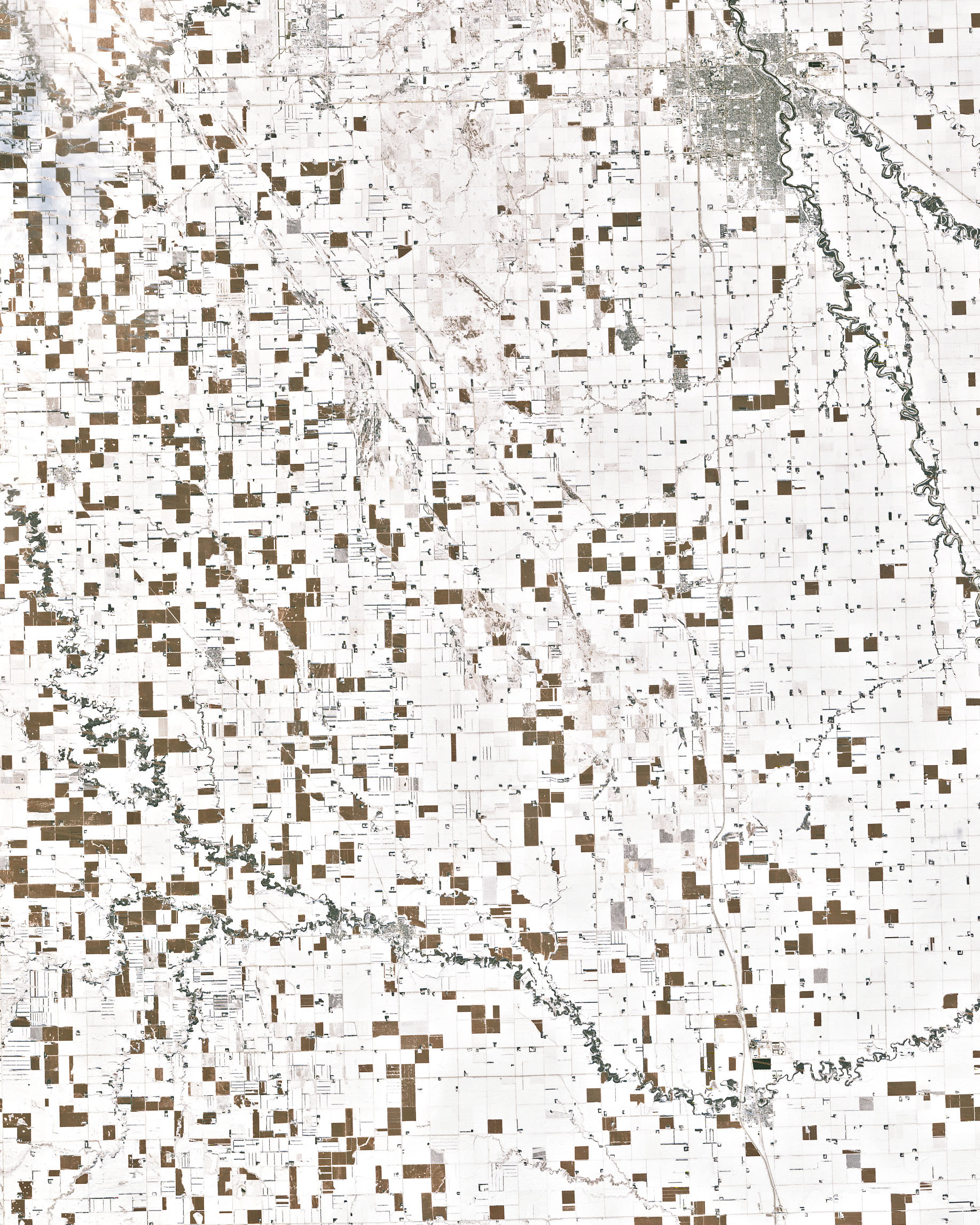 A patchwork of brown corn fields contrasts with snow-covered land in eastern North Dakota, USA. This image, captured by NASA’s Landsat 7 satellite on December 3rd, shows the city of Grand Forks in the upper-right corner. Snowfall is common this time of year in North Dakota, but full cornfields are not — normally all of the corn is harvested by now. Some news reports estimate that the amount of unharvested corn in the state is the highest it has been since 2009.
