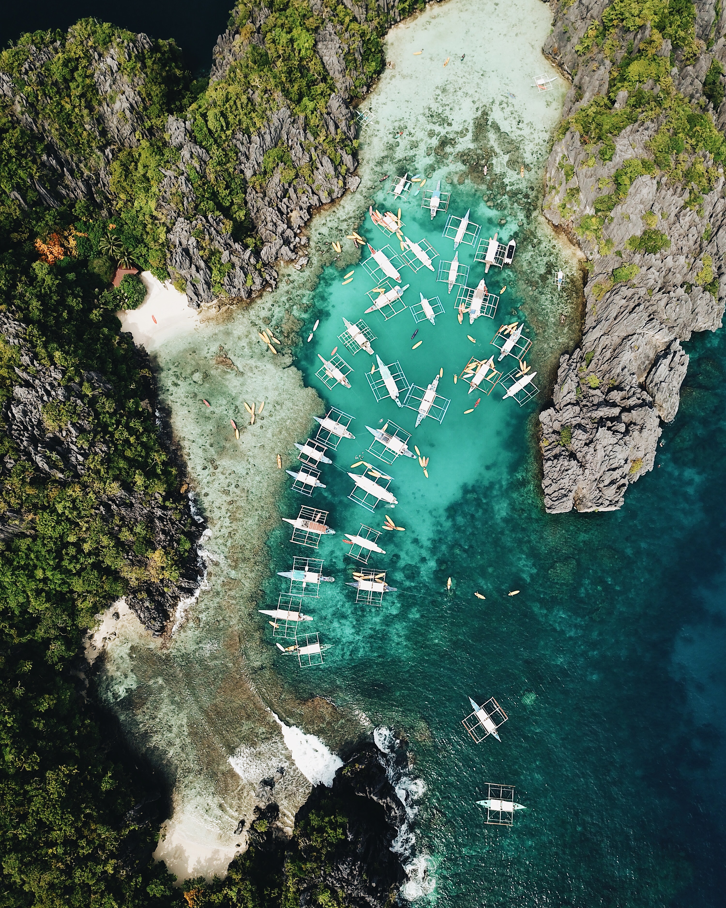 Boats are moored on a cove in El Nido, Philippines. El Nido is located in the province of Palawan, about 260 miles (420 km) southwest of Manila. It is known for its white-sand beaches, coral reefs, and limestone cliffs. In fact, it was ranked #5 on Conde Nast Traveler’s list of “The 24 Best Island Beaches in the World.”