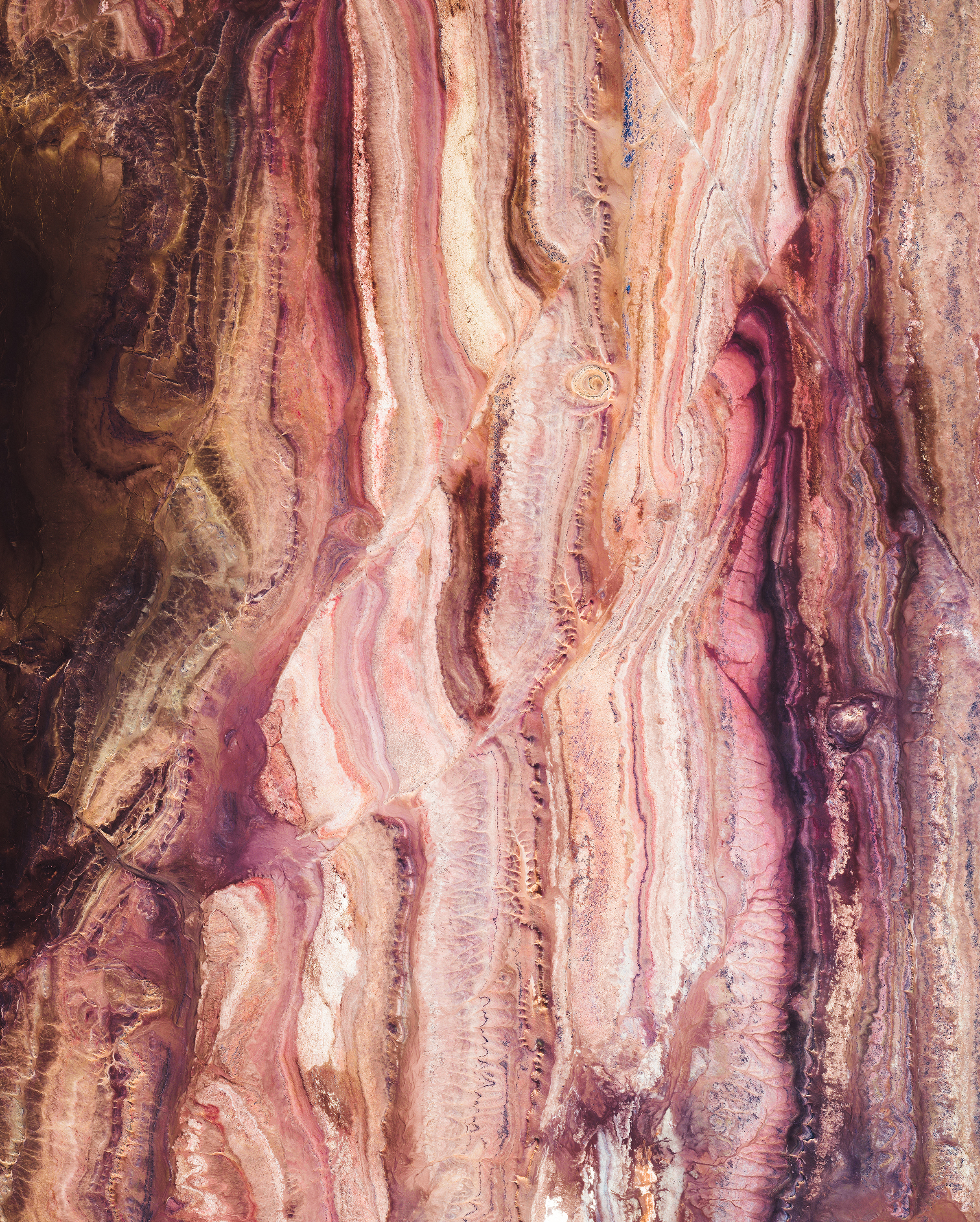 This Overview shows colorful rock formations in the Sahara Desert, west of the town of Reggane, Algeria. The climate in this region is torrid and almost rainless, with an average annual rainfall of less than 0.4 inches (10 mm). In the summer, daytime temperatures are known to consistently reach 122°F (50°C), earning this area its nickname — the “triangle of fire.”