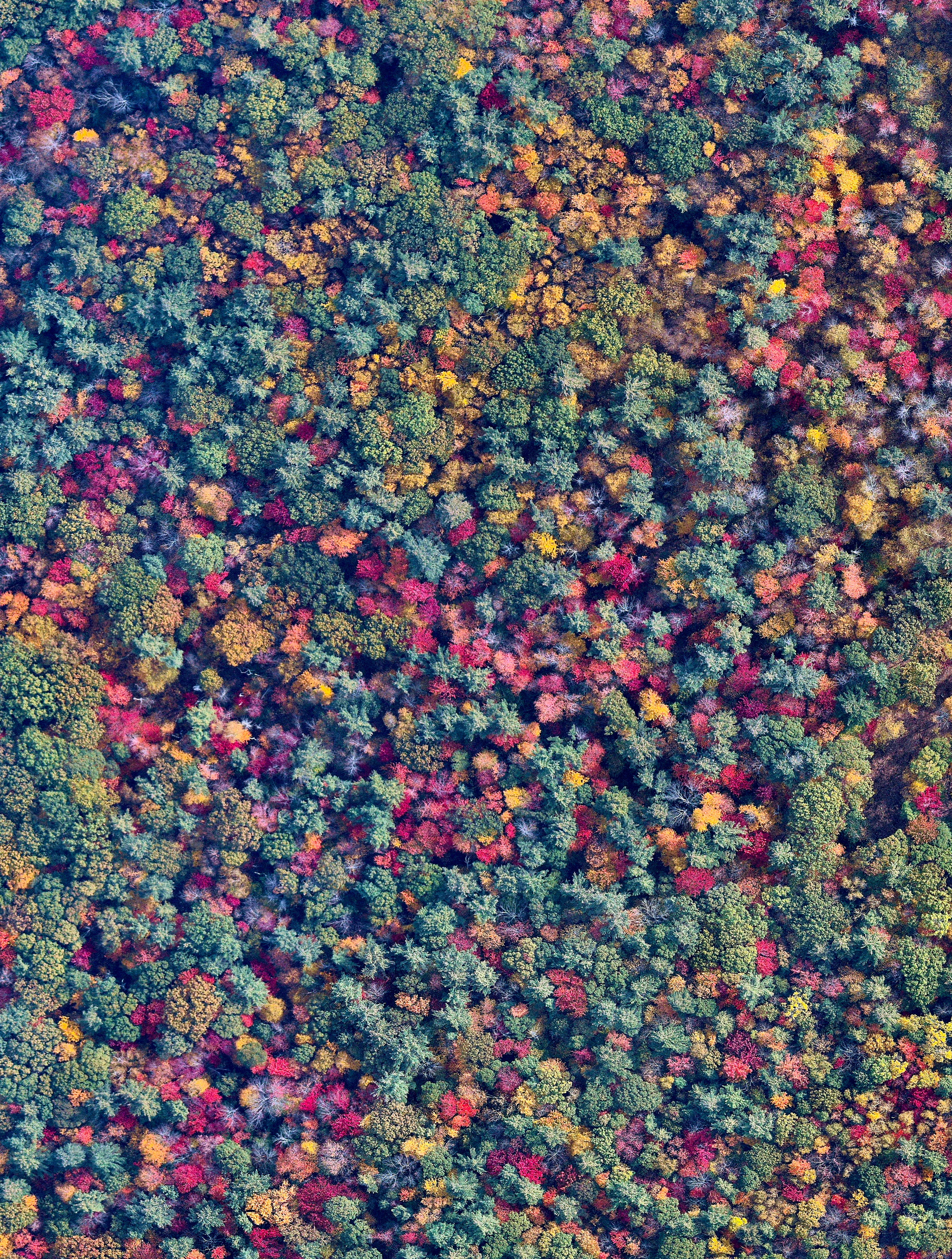 A colorful blanket of treetops is visible in Bow, New Hampshire. With the arrival of colder temperatures each year, leaves begin to change their colors, creating marvelous views like this from above.