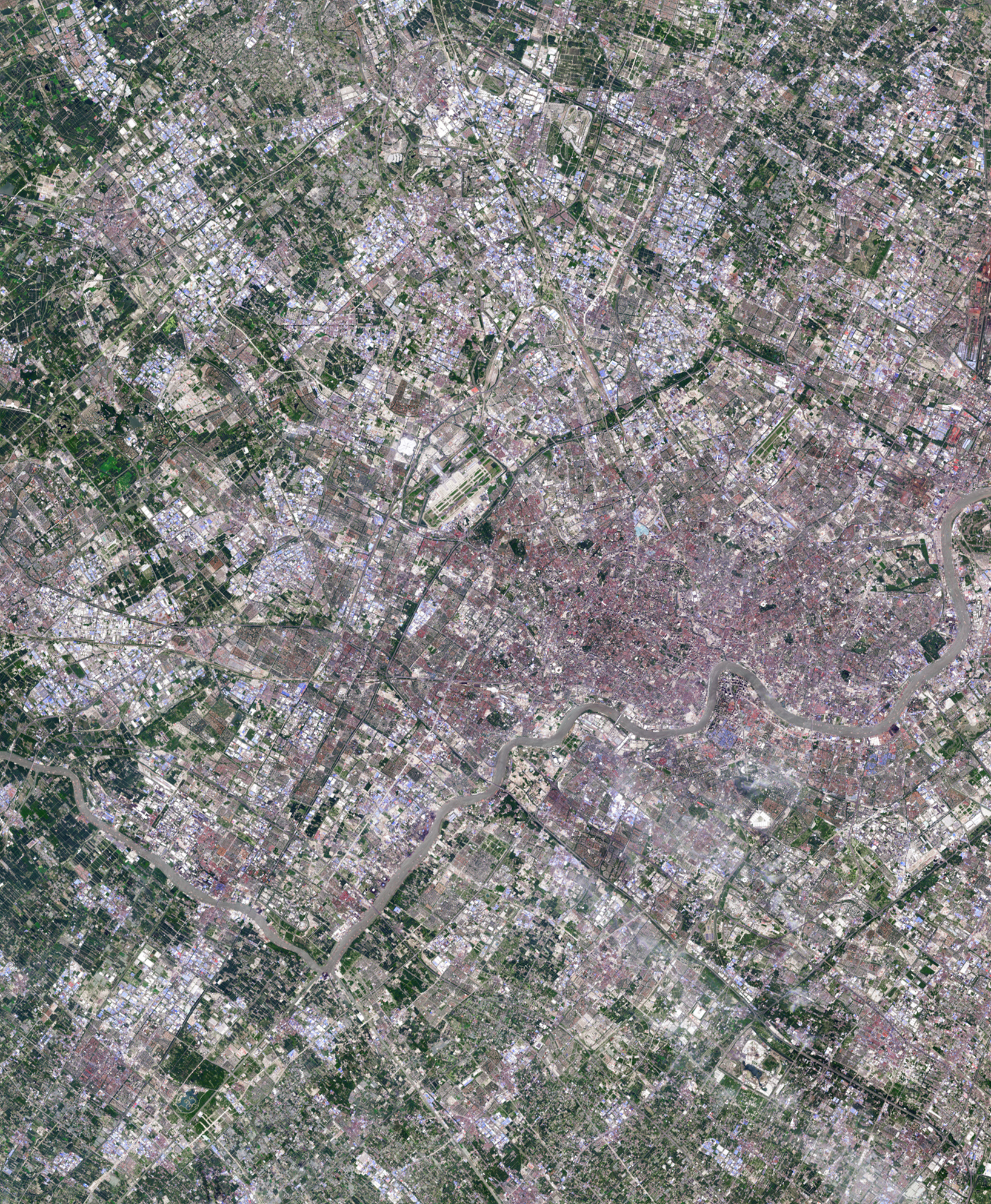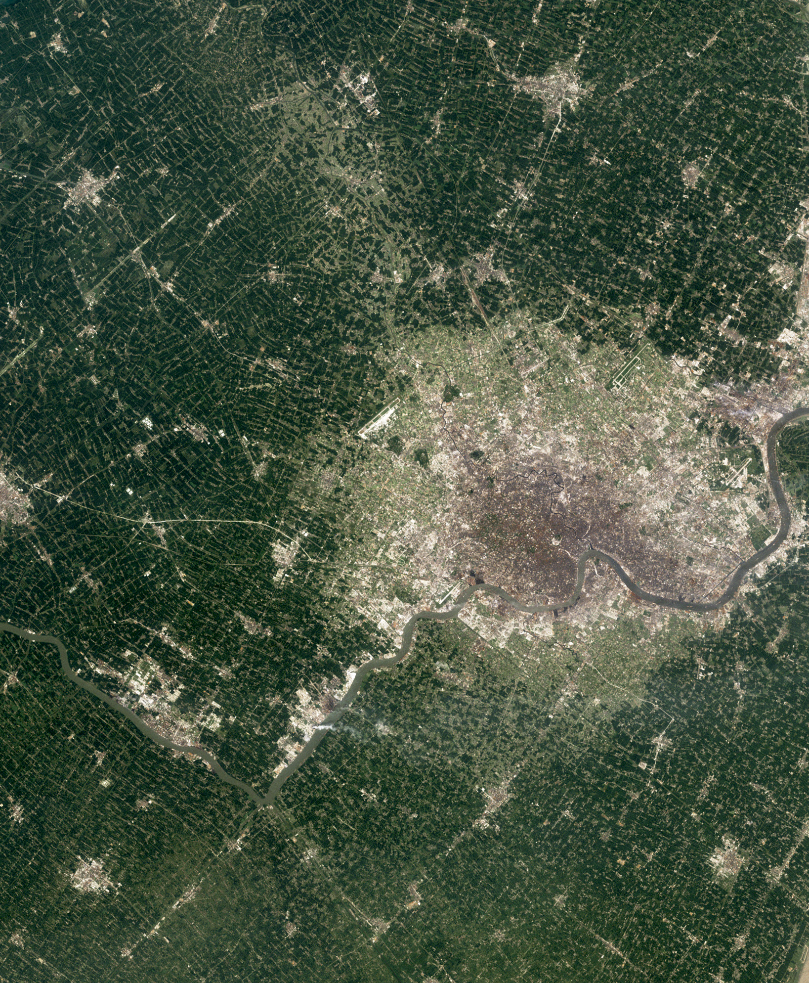 Shanghai has more than quadrupled in size since the early 1980s. Shanghai’s urban area is currently about the size of Los Angeles, but its population (now upward of 24 million) is more than double that of LA. The density that is found in cities is a necessary component of fitting an exploding population into an already-developed world. Yet, as we’ve seen with the spread of Coronavirus, high density can lead to rapid exposure in tightly packed cities. 31.224302°, 120.914889° / Source imagery: NASA