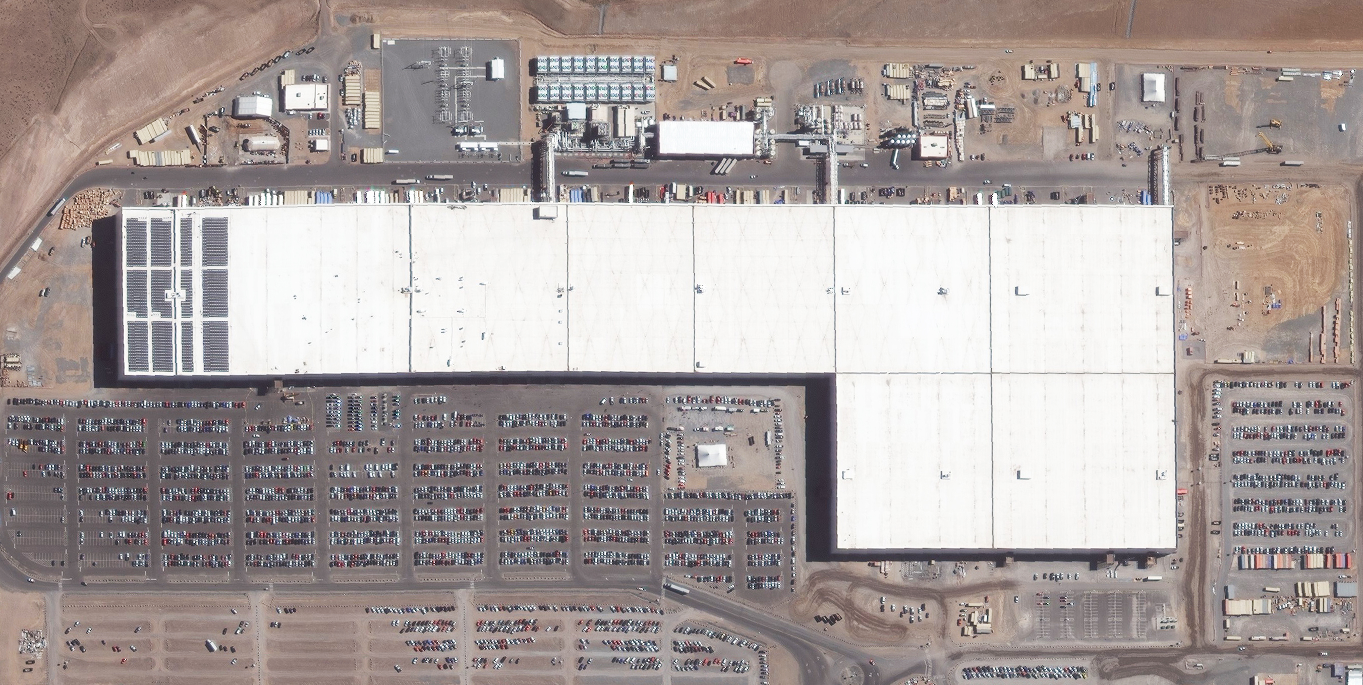 Opened in 2016, the Tesla Gigafactory is a lithium-ion battery and electric vehicle sub-assembly facility near Reno, Nevada. With plans to further expand the complex, the building is projected to have the largest footprint in the world, sprawling across 15 million square feet. When the facility operates at peak capacity, it produces more lithium-ion batteries in a year than the total amount produced in the entire world in 2013. /// Source imagery Maxar Technologies / 39.538016°, -119.441228°