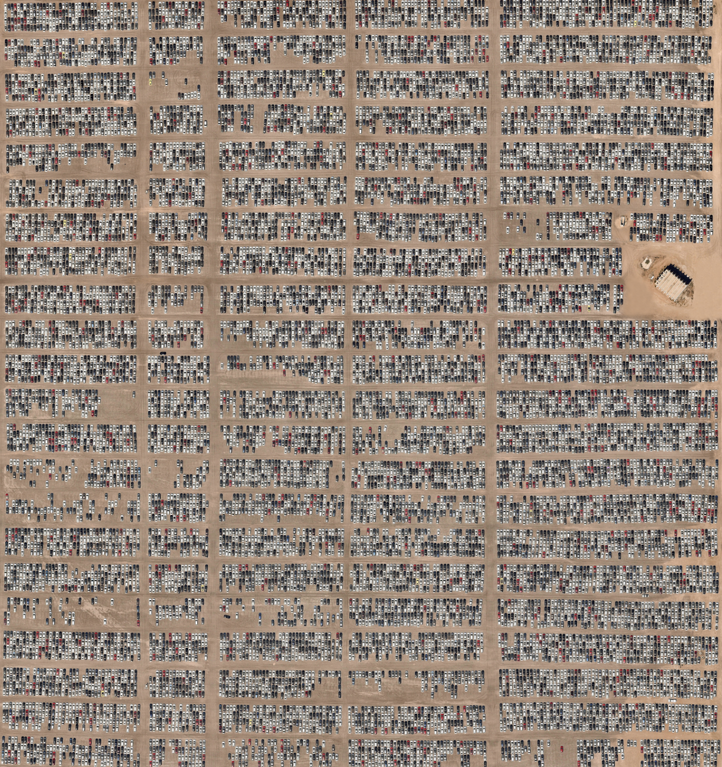 Thousands of diesel-powered Volkswagens are parked at Southern California Logistics Airport in Victorville, California. While this facility is usually used as a graveyard for retired airplanes, Volkswagen leased enough land here to park 21,000 vehicles. Following an emissions scandal in 2015, the company gave customers the option to sell their cars back to the company. The cars involved in the scandal were designed to only turn on emissions controls during testing, not during normal operation, emitting up to 40 times more nitrous oxide (one of the most potent greenhouse gases) into the air. Of the 500,000 cars involved, more than 350,000 customers elected to return their vehicles. They will continue to sit in locations like this one until they have been repaired or approved for export. /// Source Imagery: Nearmap / 34.597500°, -117.383056°